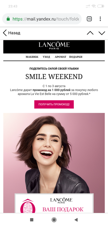 Aaygul в Выбор товаров и услуг для дома и семьи 6 лет Lancome Скидки и акции (для всей семьи) Пришло письмо на почту, может актуально кому будет https://lancome.ru/smile-animation?mindbox-click-id=74490c34-f105-470a-9dc3-06d9a161e00c&utm_source=mindbox&utm_medium=email_brand&utm_campaign=Lancome_Manual_OfferPlusGiftForOrder_SmileWeekend_Sbs_01_08_2019&utm_content=lan_othr_branding&email-ticket=456D61696C41757468656E7469636174696F6E4865787C616D792D784079616E6465782E72757C323031392D30382D30312031363A31303A3036%7CA9418C48263EA61FC9E414600AA700AA7A6C62DE177F141120902E84D95C15CD5B4EC1DCCBC1C05073D4E7F88F5D774F2150FDA0356D13F36765BAF55CC3F078 Посмотрите еще 20 записей на эту тему Отменить Ответить Скидка в 5ке на следующую покупку Банковская карта JCB Чаты Беременных Выберите чат: Январята-2026 Февралята-2026 Мартята-2026 Апрелята-2026 Майчата-2026 Июнята-2026 Июлята-2026 Августята-2026