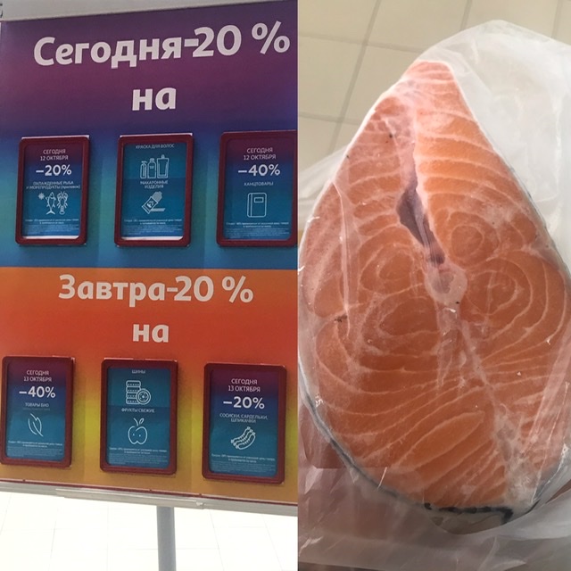Хорошая цена выходит сегодня на стейк семги в ашане. По акции кг стоит 999 плюс на всю рыбу минус 20. 800 вроде бы нормально выходит