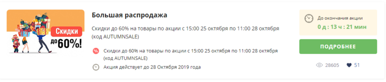 Скидки и акции (для всей семьи)На сайте в разделе акций появилось заманчивое предложение - скидки до 60% . И объяснение - по коду получаете скидку 30% (естественно от первоначальной цены), а еще 30% можете оплатить баллами. В реальности эта акция даст Вам скидку максимум 51%.