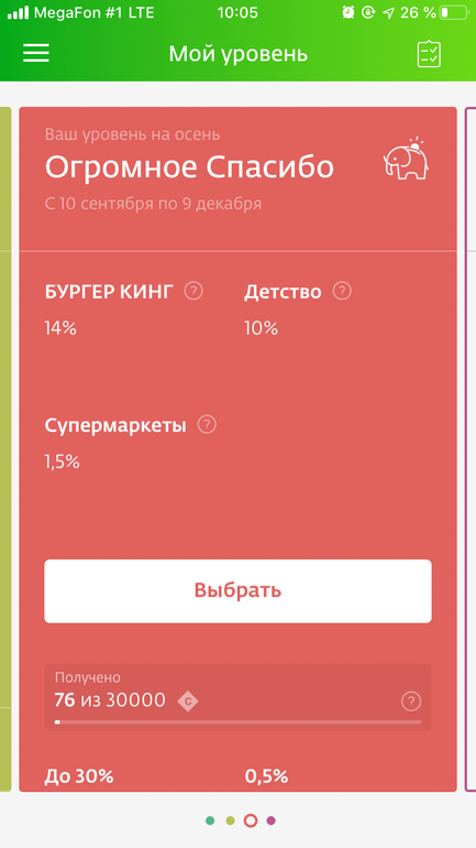 нет, я вообще наличкой не пользуюсь последние месяцы. Я сейчас зашла в Сбербанк Онлайн. Полная фигня. Мой уровень почему-то начальный, просто Спасибо. И выбрать я могу только сферу Развлечений с повышенным кэшом. А Развлечения мне нафиг не нужны... Мне бы детское, супермаркеты... Не дает их выбрать.