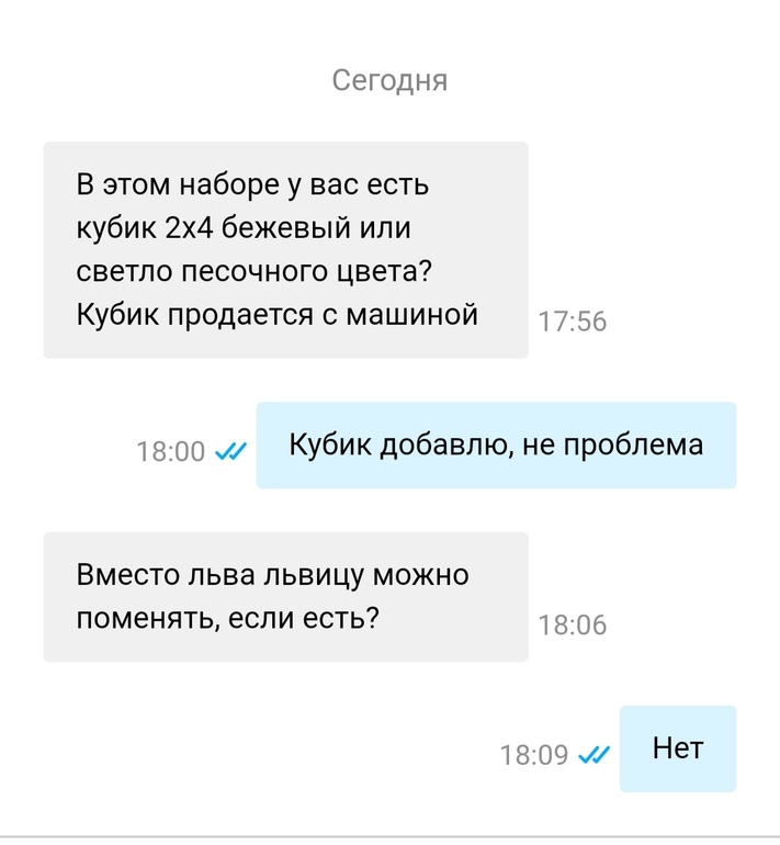 БолталкаНе понимаю, народ серьёзно это пишет или издевается, как понимать? Продаю грузовик лего, в наборе человечек и лев. И вот такая переписка 😆