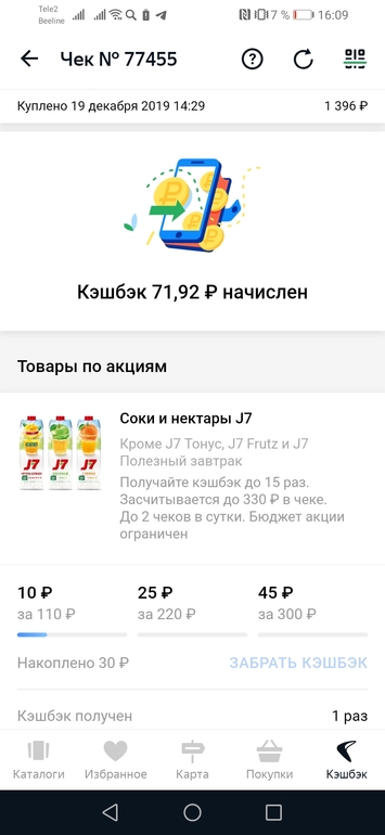 Получен кэшбэк на сок в Едадил 72 рубль.