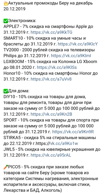 Ptahha в Выбор товаров и услуг для дома и семьи 6 лет Беру промокод на 5% Промокоды, Баллы, Бонусы. Купоны на скидку Есть ли ещё промокод в Беру на 5% кроме PICO5? Посмотрите еще 20 записей на эту тему Отменить Ответить мария Www.beru.ru/special/promokody 21.12.2019 Ответить Oluma Мария, извините что здесь, но как называется сайт где вы термобелье мелким заказываете? где хорошие скидки на джоху? 21.12.2019 Ответить мария Www.joha.ru Так наверное. Когда распродажа тогда норм 21.12.2019 Ответить Edel 21.12.2019 Ответить Оффпрайс промокод Подарочки для клиентов Сбера Чаты Беременных Выберите чат: Январята-2026 Февралята-2026 Мартята-2026 Апрелята-2026 Майчата-2026 Июнята-2026 Июлята-2026 Августята-2026