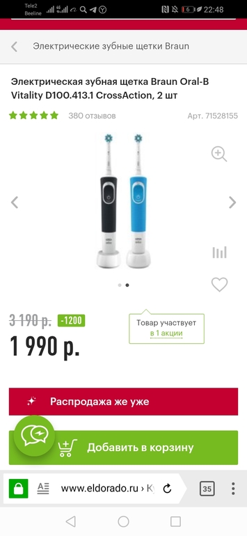 Распродажи, скидки, акции. Фоторепортажи из магазиновhttps://www.eldorado.ru/cat/detail/elektricheskaya-zubnaya-shchetka-braun-oral-b-vitality-d100-413-1-crossaction-2-sht/Еще акция с СМС идёт, вчера выкладывала