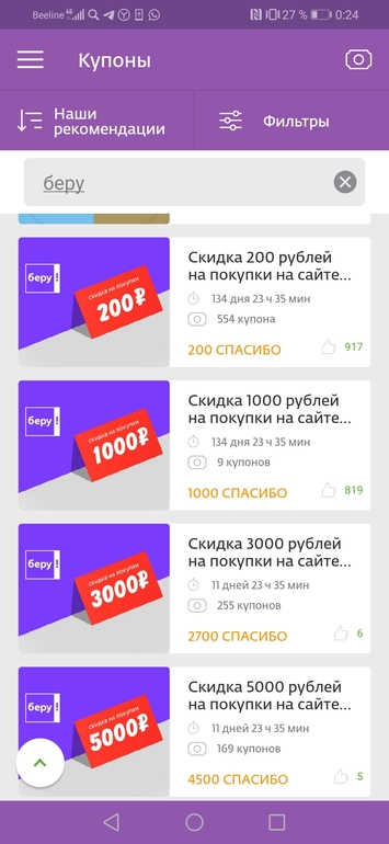 мария в Выбор товаров и услуг для дома и семьи 6 лет Спасибо Скидки и акции (для всей семьи) На 5000 и 3000 скидка 10 процентов Скриншот из приложения Спасибо от Сбербанка Посмотрите еще 20 записей на эту тему Отменить Ответить dushe4ka Мария,а где найти их? Я нашла только,что партнер "беру" а промо не нашла( 20.04.2020 Ответить мария Это покупается за баллы сбербанка с дисконтом 10 процентов. Я больше не знаю так как у меня нет сберкарты 20.04.2020 Ответить dushe4ka Это спасибо от сбербанка?А где купить можно? Я у себя в приложении не нашла такие предположения,пыталась через яндекс найти,тоже безуспешно(Могли бы сказать куда зайти именно? 20.04.2020 Ответить мария Через поиск в приложении поищите 20.04.2020 Ответить 20% скидка промокод на Учи.ру Али Чаты Беременных Выберите чат: Январята-2026 Февралята-2026 Мартята-2026 Апрелята-2026 Майчата-2026 Июнята-2026 Июлята-2026 Августята-2026