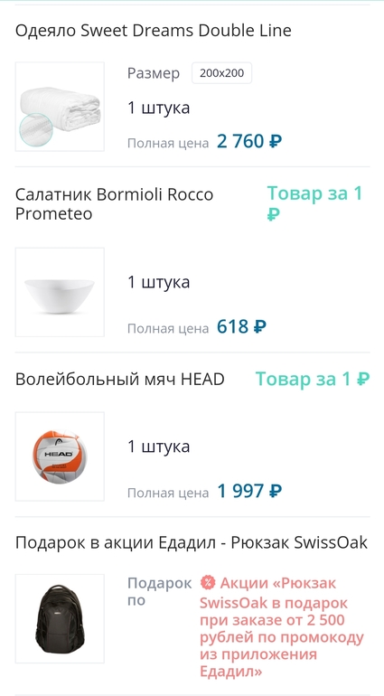 Фишка #2. Как видите, у меня в заказе и бесплатный топор, на который была акция с Едадил в мае. И одновременно рюкзак, акция на который сменила топор в июне. Код на топор был также ранее введен. И хоть акция закончилась, топор остался в корзине. Вывод #2: надо вводить все промо, даже если не собираешься делать заказ. Немного жалею, что промо на стаканы майские из Теле2 не ввела. Ну и так хорошо вышло.