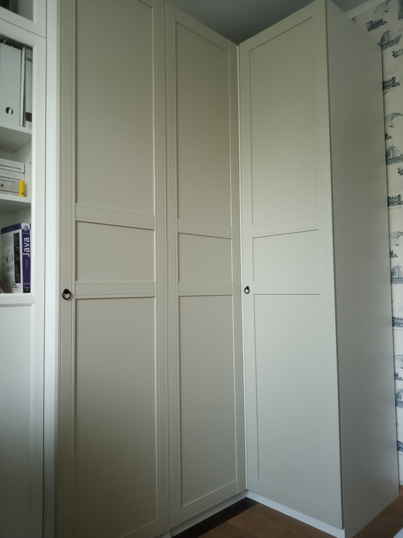 У меня тоже стояла задача в детской в угол поставить шкаф и чтобы туда убрать все по максимуму, и я тоже люблю Икею, но в этот раз отказалась, так как хотела именно один большой шкаф.