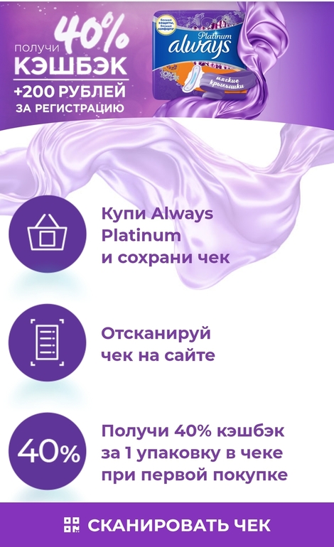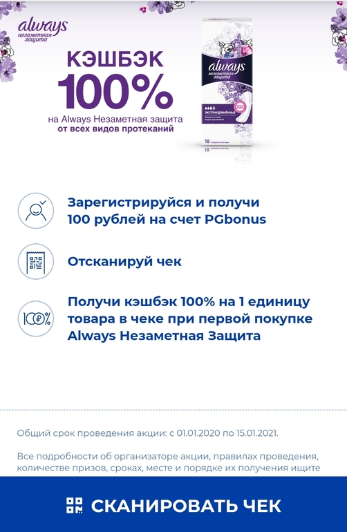 3. Акция 100% кэшбек за покупку ежедневок Always незаметная защита работает до конца июля. Они есть на Вб, в Ленте, Магнит-косметик.