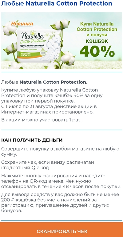 1. Появилась новая акция с 40% кэшбека на Naturella Coton Protection. В июне её не было. Обратите внимание: акция на них не действует в Интернет-магазинах. Надо поискать оффлайн.