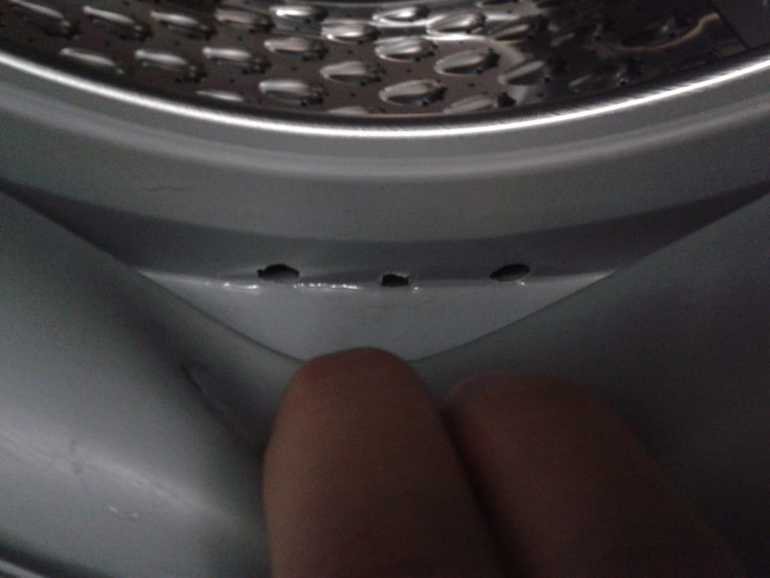 Добрый день! Обнаружила в нашей стиральной машине такие дырки в резиновом круге (не знаю, как его назвать) в самом низу, там где обычно скапливается вода. Я там губкой протирала, иногда там остаётся пена, и обнаружила их, вроде раньше не было или не замечала. Муж считает, что так и должно быть, что это типа сливные отверстия для слива скапливающийся воды, подозрительно то, что они на равном расстоянии и крайние одинаковой формы. Прошлая машинка у нас была другой конструкции, там резина была другая без этих загибов. Не могли бы вы глянуть, есть у кого такие же отверстия или это все же у нас порвалось там. Я прям в расстройстве, машине нет и года... Bosh.