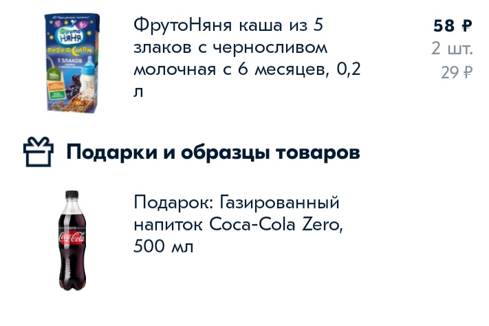 За покупку двух товаров дарят бутылку кока колы зеро 0.5 литров . Подарок показывается после заказа.