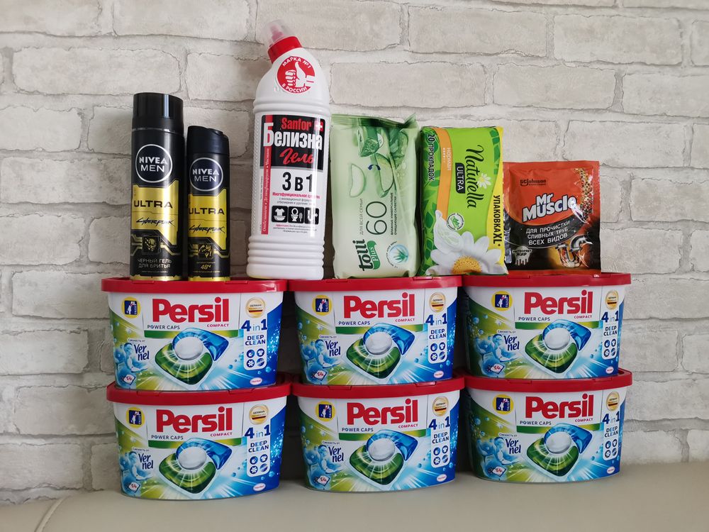 Я капсул взяла, Персил, Ариэль и Лоск на пробу. Папия 4 слойная, Фейри, Тафт, Палмолив - гель для душа, прокладки разные,освежитель воздуха, Пемолюкс...
