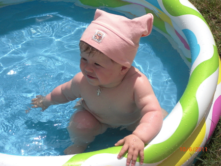 Когда мы первый раз пришли на море, Ксюшка очень долго на него смотрела из коляски. А когда я ее поставила на песочек и маленькая волна окатила ее ножки, она заплакала. И даже когда я брала ее на руки и заходила по колено в воду, она тоже плакала. Поэтому мы купили ей небольшой басейн, в котором она плескалась около нашего домика.