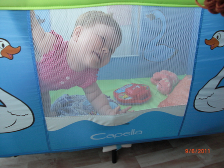 Ксюшка спала в манежике, который мы брали с собой. В нем она и игралась на терассе пока папа пил пиво!)