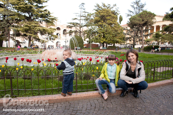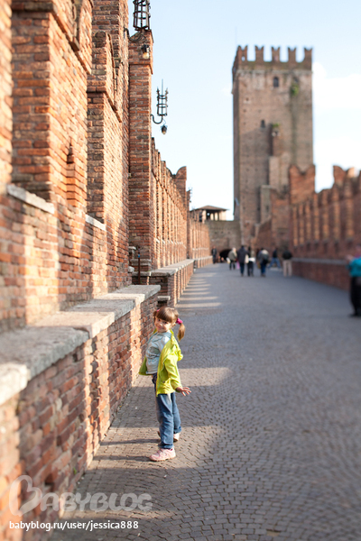 Мы погуляли по городу: сходили к дому Джульетты (туристов там толпа, и все исписано-расписано). Дом Джульетты принадлежал роду Даль Каппелло (прообраз семьи Капулетти), их герб в форме мраморной шляпы расположен на арке, ведущей во внутренний двор. В 1667 году дом вместе с несохранившейся башней был продан одним из представителей рода Каппелло и затем неоднократно менял хозяев. Дом полностью обветшал и был выставлен хозяевами в 1907 году на аукцион. Его приобрёл муниципалитет для устройства в нём музея, посвящённого шекспировской пьесе, но длительное время дом продолжал находиться в запустении. Активные реставрационные работы по приданию дому соответствующего легенде романтического вида начались после выхода в 1936 году фильма Джорджа Кьюкора «Ромео и Джульетта», вызвавшего к нему большой интерес. Кирпичный фасад был украшен декоративными элементами и дополнен «Балконом Джульетты». ( http://ru.wikipedia.org/wiki/%C4%EE%EC_%C4%E6%F3%EB%FC%E5%F2%F2%FB ).