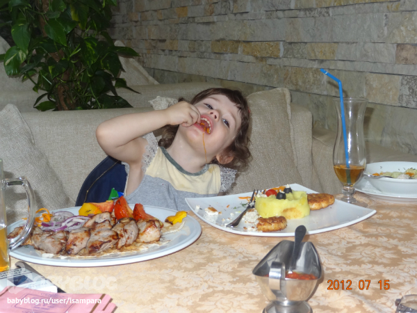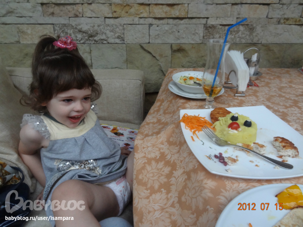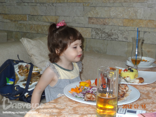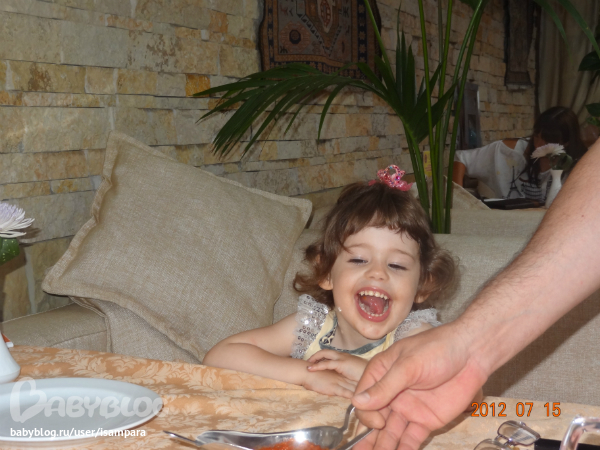 Есть детская комната (бесплатная), по воскресеньем в ней халявный аниматор до 18:00. Еву оставляю спокойно и наслаждаюсь ужином, а в 20:00 с открытой веранды мы перемещаемся в основной зал, где начинается живая музыка:) Такая вот армянско-кабацкая.. Ева радостно пляшет, меня мотивчики вгоняют в юность, ностальгия, кааайф:)))) Поют кстати очень хорошо. Звук нормальный.
