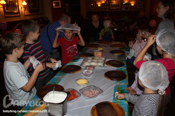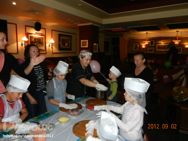 В этот раз дети готовили пиццу. Особенно понравилась подготовка к приготовлению - всех детей одели в фартуки, шапочки, колпаки и перчатки и начали работать. Готовые пиццы ели сами дети и их родители.