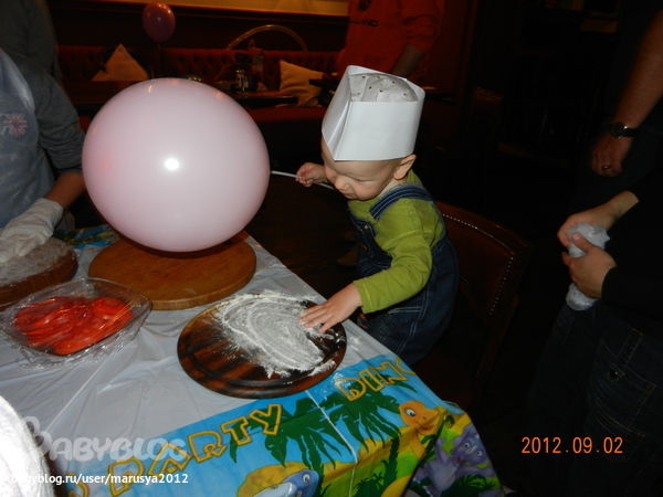 В 2 часа у них как раз начинался мастер-класс "Сам себе повар" (радует, что бесплатный). Нам 1,8 мес и мы тоже поучастовали - работали с мукой, на большее нас не хватило, дальше мы наблюдали за старшими детками и бегали с шарами - хорошо, что всеь малый зал был украшен шарами))).