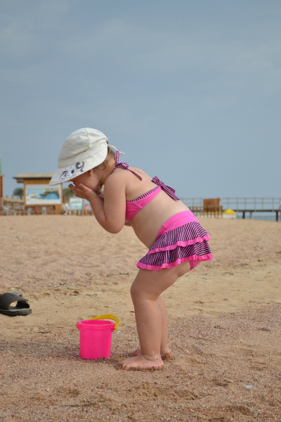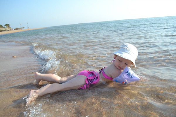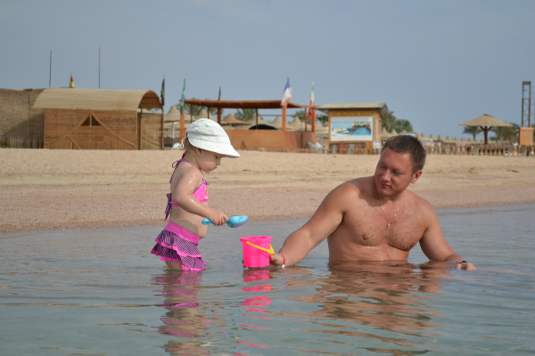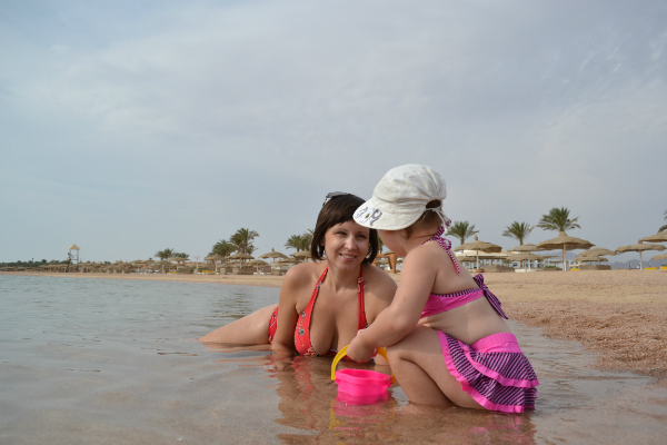 А вообще, целый день проводили на море. Вставали в 6,00 часов. В 7 шли на завтрак или пили чай/кофе с булочками, припасенными с ужина, в лобби на улице. Там же я набирала кипяток для каши Вериной. Потом брала кипяток в баре на пляже и в ресторане на ужине. И шли на пляж. Температура воды +29. Это сказка. В 7,30-8,00 часов утра Вера залезала в море и плескалась там часами!!! Потом я одевала ей футболку и она дальше плескалась. Три дня было облачно. Я впервые видела в Египте облачность. И это даже было к лучшему - солнце пробивалось сквозь облака, но не палило наши плечи.
