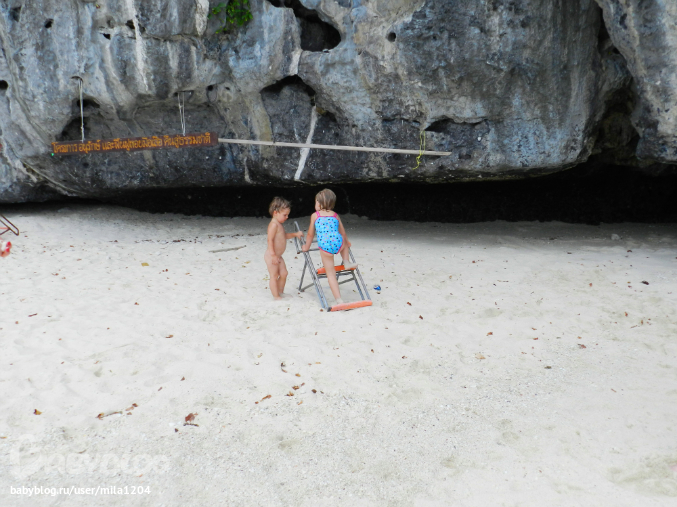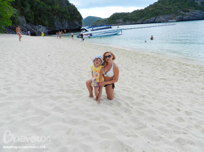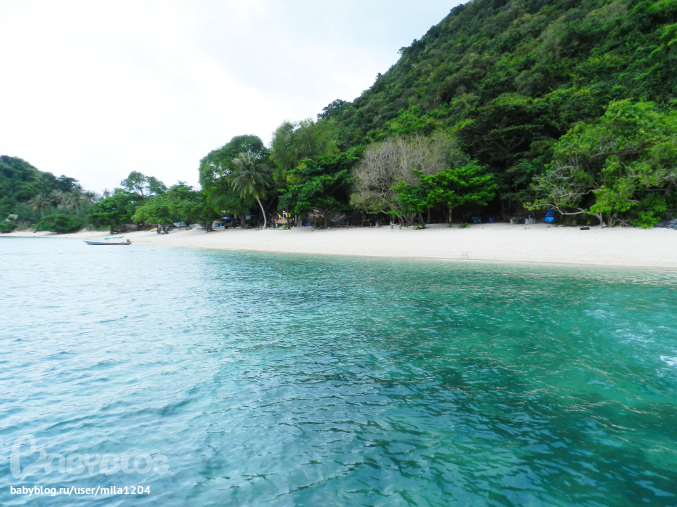 План экскурсии у нас был немного другой чем в описании экскурсии выше. Сначала мы приехали на первый остров Мэко, там где изумрудное озеро на высоте, небольшой пляжик, народу полно было. Мы с Ксюшкой (мама Ильюши) не решились топать по крутой и длинной лестнице вверх и остались па пляже. А наши папы вооружившись фотоапаратами полезли наверх. Мы уже потом на фотике смотрели обалденные виды и озеро сверху. Через минут 15 почти все туристы с пляжа разьехались, человек 10 может осталось. Детишки порезвились в воде (кстати очень прозрачная) и вскоре наши мужья спустились. Еще 30 минут поплескались, попили кофе и нас уже зовут на катер. Поплыли дальше, по пути много необитаемых маленьких островков попадалось, один был с профилем обезьяны под определенныим углом.