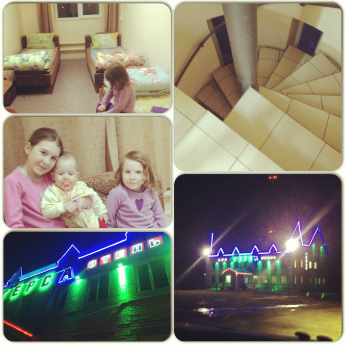 В номере три кровати,две из которых мы соединили вместе и я с Настей и Соней спала на ней,а муж с Дашей на другой.Туалет.душ общий в корридоре,кафешка внизу на 1 этаже.Мы каждый раз там на начлег остаемся.Стоимость также 1500.Там мы проснулись очень рано-в 6 утра,поэтому попили кофе я и муж и поехали дальше,позже остановились в нашем любимом отеле Итиль покушать.Отель и кафе там Европейского уровня!!!Вот такими я считаю должны быть ВСЕ отели и кафе в России!очень советуем это место(ночлег дорогой-3 тысячи минимум),но покушать-СУПЕР....