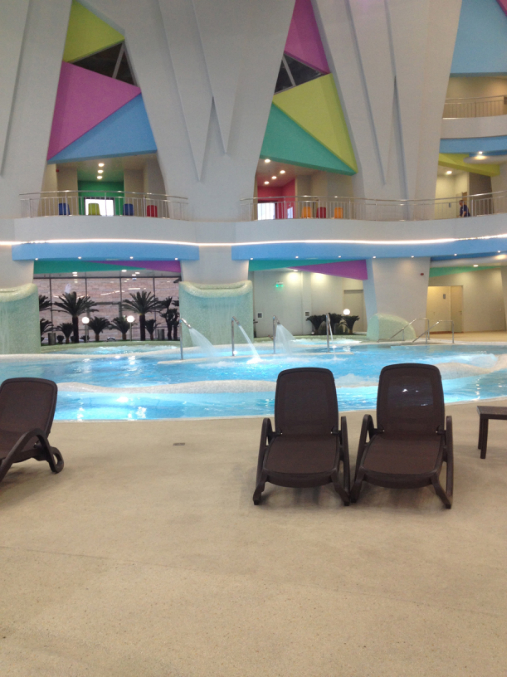 Стоит достаточно много шезлонгов, на полу покрытие под песочек-камушки, приятное, но Лариоша, ползая по нему поцарапал коленочки. При входе лежит куча спасательных жилетов, которые можно одевать на деток, мы не стали, так как были с собой нарукавники, ну а Лариончика почти не спускали с рук, благо взрослых было достаточно.