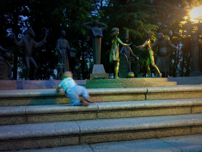 Памятник огорожен цепочкой, и пройти на его ступеньки нельзя, но Никита требовал его отпустить. Я решила - пусть идет, ему можно. А сама осталась наблюдать за оградой.