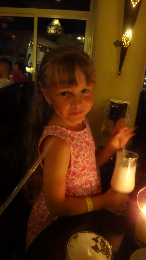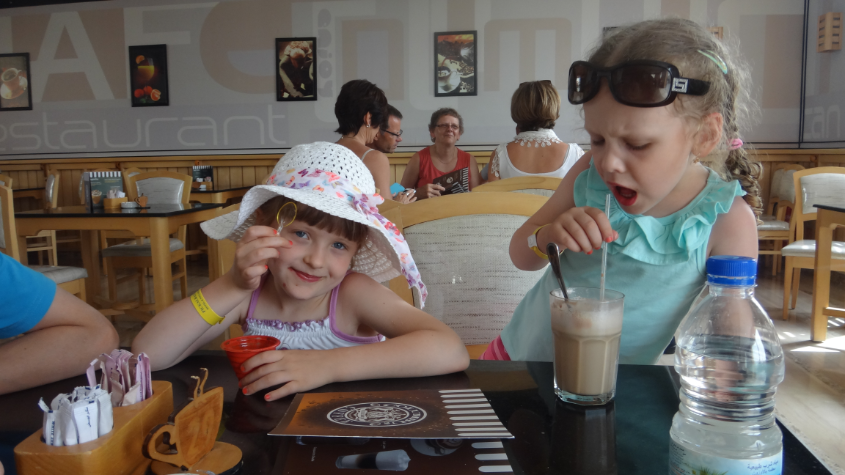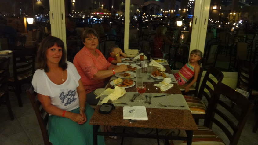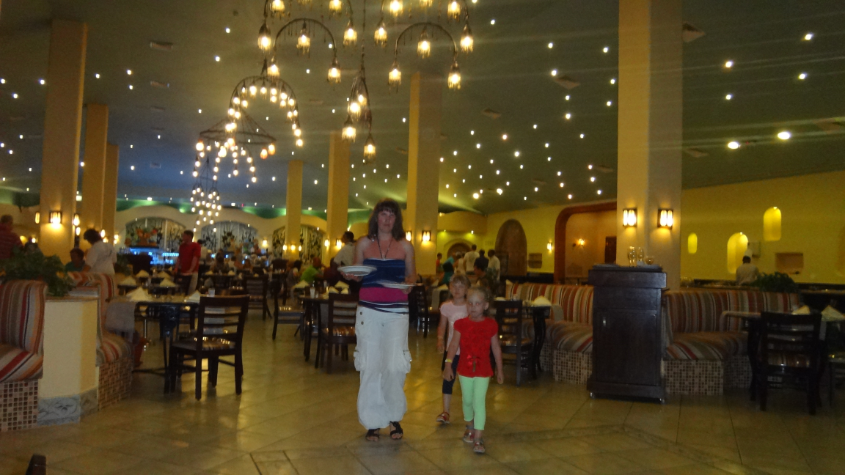 Питание. Тут все супер! Несколько ресторанов, нет а ля карт, можно пойти в любой ресторан или во все сразу))) По большому счету все почти похожи друг на друга, как мы поняли, просто чтобы не было большого скопления народа и очередей все распределяются по ресторанам. Основной ресторан нам понравился больше всех, там больше места, просторней, есть большие столы для больших компаний. По утрам свежевыжатый сок, очень вкусный, яичница, блинчики. На ужин было как то шампанское и пару раз тигровые креветки на гриле, так же на ужин гриль ягненок, индейка, курица, рыба. При тебе делают пиццу, пасту. А вот овощей не так много огурцы, помидоры и всегда капуста, салат из капусты, зелени нет совсем(ну может для Египта это нормально), из фруктов яблоки(вкусные), бананы, финики, сливы, виноград.