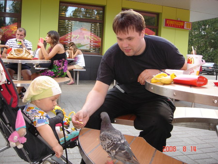 Когда папа кормил гулей он поймал одного, но испугался и тутже отдернул ручулю.
