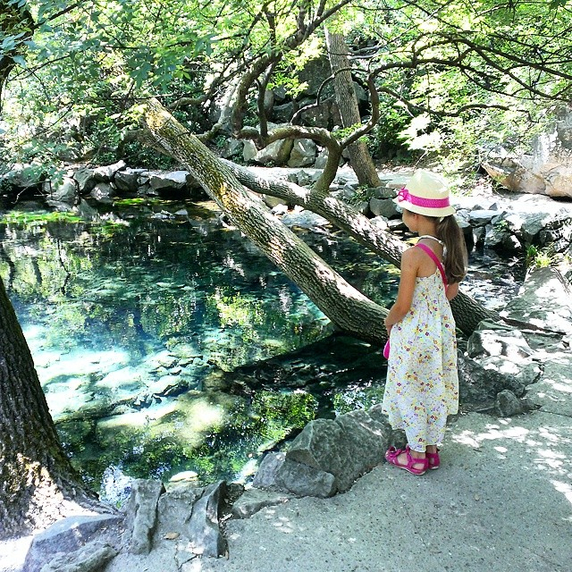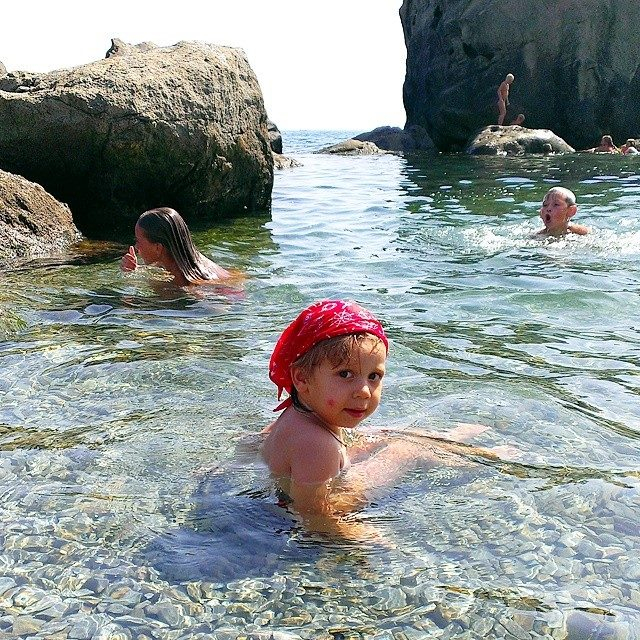 После парка мы пошли на Детский пляж. Все тут замечательно, кроме острой гальки и не очень чистого моря, потому что залив неглубокий и течение редко обновляет воду в нем. Зато, полный штиль в любую погоду, по щиколотку в воде рыбы без стеснения щекочут тебе пятки, живописные камни вокруг и маленькая глубина - просто идеально для деток. Федюня так оторвался - час сидел в воде! Плавал, по шею бродил там по дну...в общем, восторгу дитя не было предела. Ради такого случая, он даже примирился с платком на голове. В остальных случаях он любой головной убор снимает.