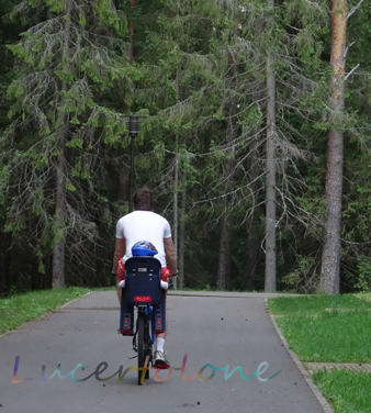 Катание на велосипеде в специальном кресле прошло на ура. Колесили в поисках дятла, белочки и кукушки, они тоже живут по соседству.