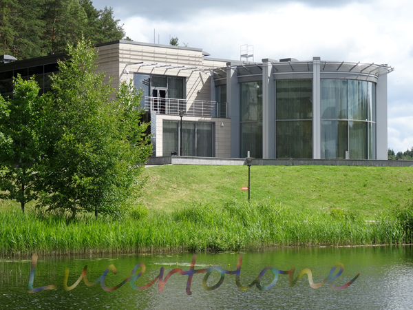 На территории есть и комплекс типа гостиничного, но 4 стены я и дома вижу, а вот дачей мы не обзавелись, поэтому решено было поселиться в коттедже. Вот так вот выглядит кусочек большого здания, в котором и номера, и столовая, и Spa. Чуть ближе - лодочная станция.