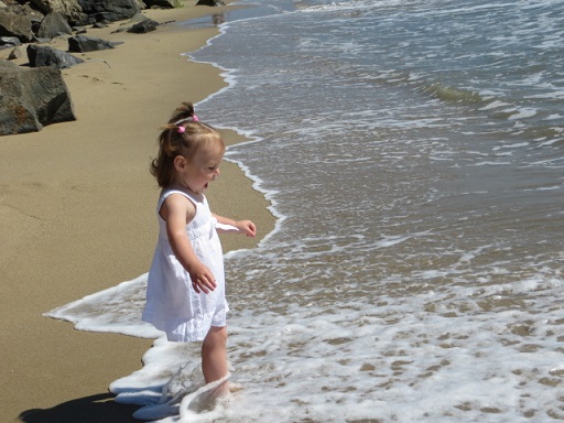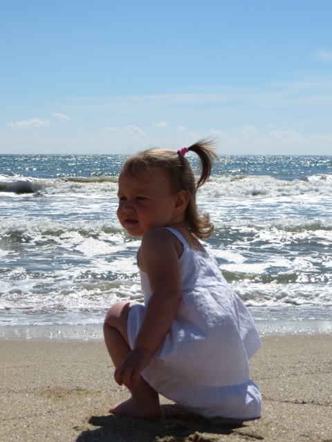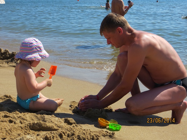 С песком играла мало. Пару раз папа смог заинтересовать ее строительством дамбы, а мои куличики и пироги она игнорировала.