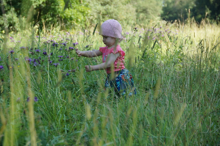 Если свернуть с главных дорожек усадьбы и углубиться в лес, то можно пройти через лужайку, пересечь Старый Заказ. Наш юный ботаник бесстрашно бросалась в самые непроходимые травяные заросли, исследую местную флору.