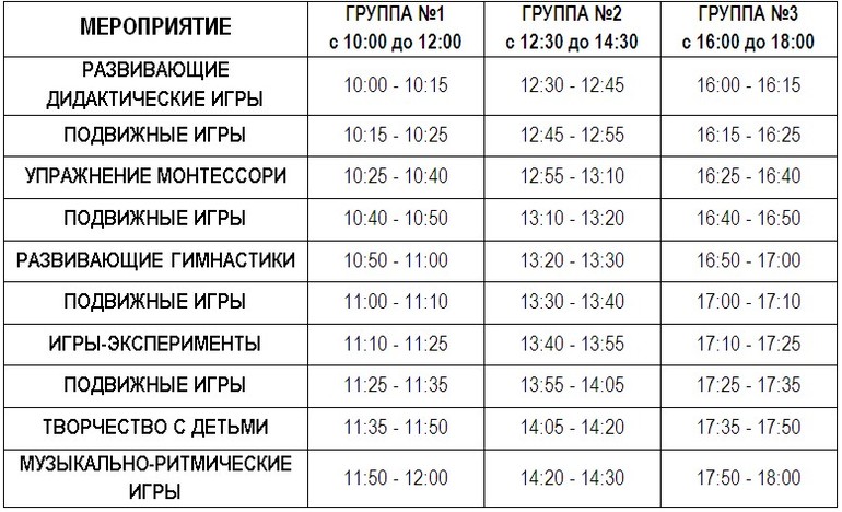По программе "Семь чувств" работает няня педагог Марина. В соответствии с расписанием няни педагога вы можете оставить ребенка от 2 до 4 лет по предварительной записи на 2 часа (одно занятие проходит 2 часа).
