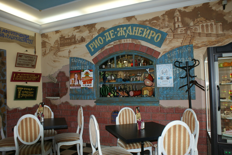 Ну а перекусить после такой отличной прогулки мы заглянули в кофейню, что находится в самом центре Костромы. Такая забавная! "Рога и копыта")). Стилизована под фильм 12 стульев.
