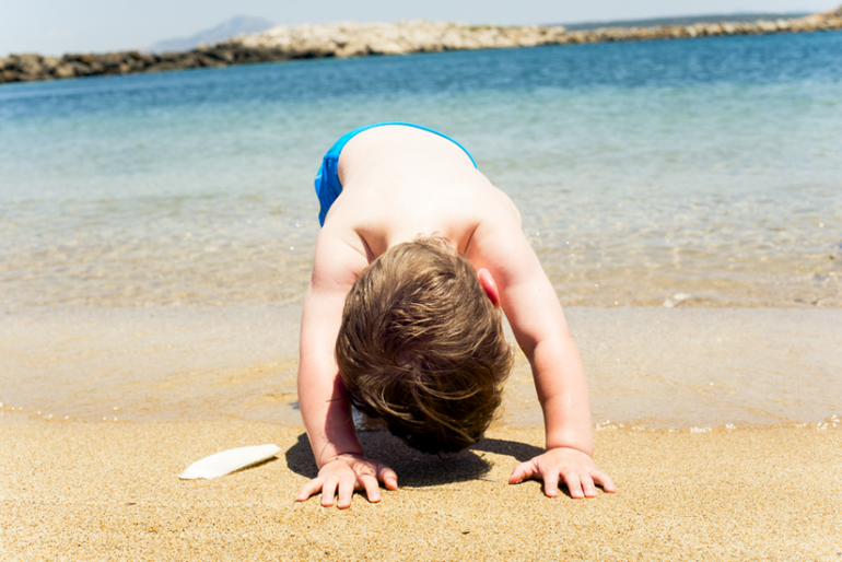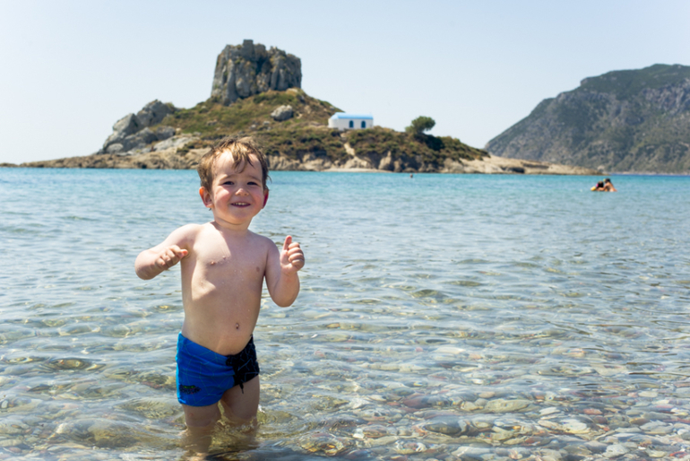 А вторая - спокойная, как зеркало. С плавным песчаным заходом в воду и очень теплой водой. Это лучший пляж для малышей из тех, что мы видели на Косе.