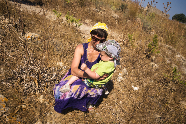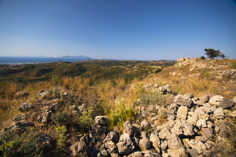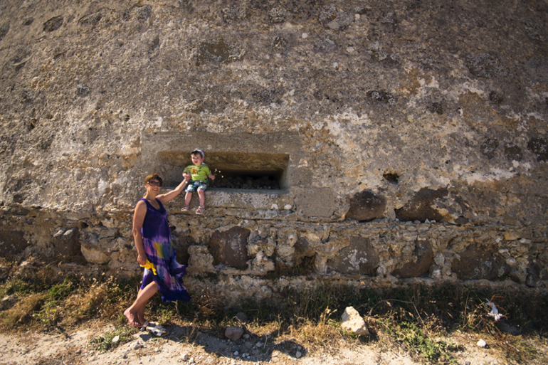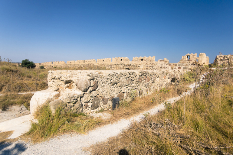 Сначала нас завезли в развалины рыцарской крепости невдалеке от поселка Антимахия. Меня не особо впечатлило. Среднестатистическая руинка :) Довольно большая по площади. Вид оттуда красивый. Травой колючей все заросло изрядно. Гид в отеле нам сказала, что на экскурсию можно взять коляску - везде можно проехать. Хорошо, что мы ее не послушали и взяли эргорюкзак! С коляской тут делать было бы нечего.