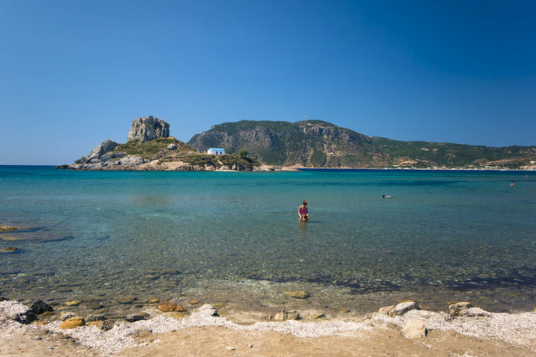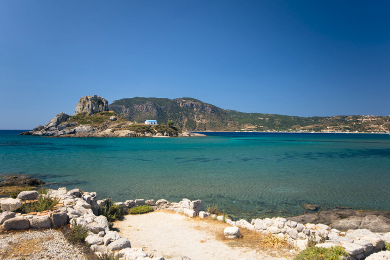 Дальше мы отправились на сам полуостров Кефалос. Певая остановка - у древнехристианской базилики Агиос Стефанос. От нее мало что осталось. Говорят, на полу сохранилась мозаика, но большую часть времени она засыпана песком для сохранности, так что мы ее не видели. Зато виды открываются шикарные.