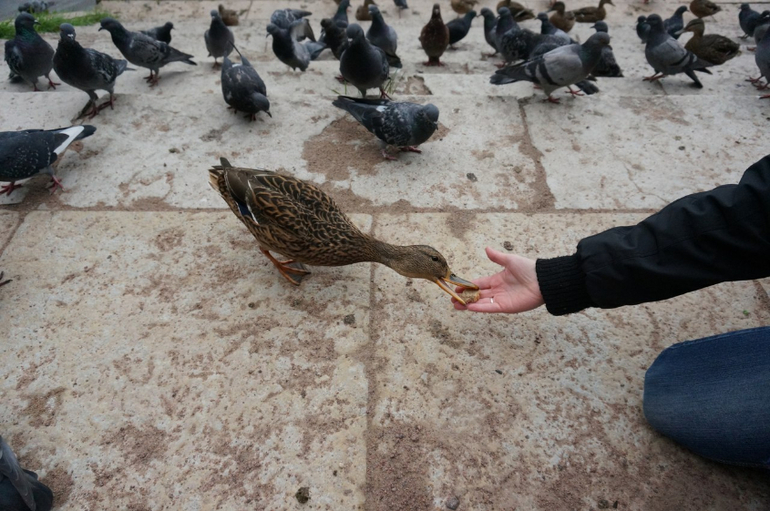 Утки, скажу я вам, совсем оголодавшие. Это в Питере у каждой лужи мамы и бабушки с детьми каждый по пол-батона скармливает. Так у нас они еле ползают. А тут бодренькие. По газонам бегают, еду выпрашивают