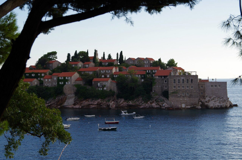 Неподалеку была "припаркована" яхта. Пройдя по парку Милочер и поднявшись по ступенькам наверх, мы увидели картинку с путеводителей - визитную карточку Черногории - остров-курорт Свети Стефан. На этом острове отдыхало и отдыхает много известных персон, цены на жилье тоже приличные. Попасть туда могут либо постояльцы отеля, либо забронировавшие столик в местном ресторане. Нам хватило пофоткаться просто на фоне острова.