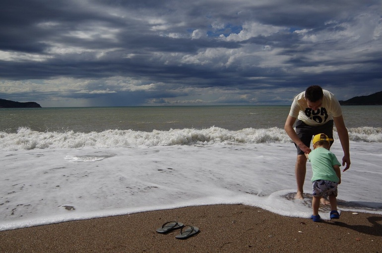 и вернулись к вечеру в квартиру под вновь начинающийся дождь. Все последующие дни было вполне приемлемо: тепло, но не жарко, градусов 26-28, иногда солнечно, иногда нет; вода на удивление доя нас была теплая, ребенок с радостью купался либо копошился на берегу.