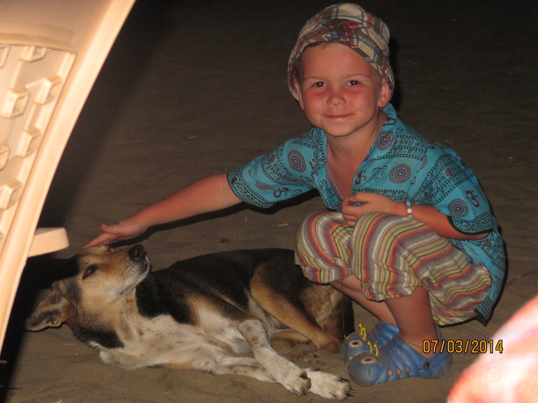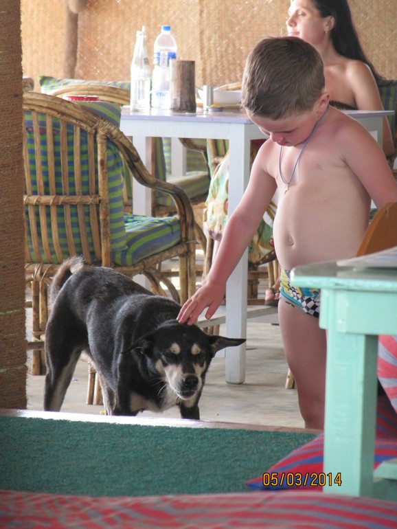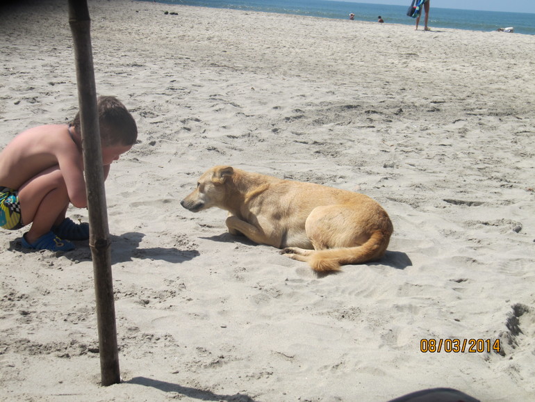 На пляже очень много бездомных собак. Там, кажется, что даже собаки какие-то добрые))) Они просто спокойно лежат в тенечке, прячутся под лежаками. Сын очень боялся собак, в детстве его собака напугала и он их в-принципе побаивался и обходил стороной. Там же, он прилипал почти к каждой собаке и говорил мне "Мам, смотри, какие у нее грустные глаза. Наверное, она потеряла маму. Давай домой возьмем ее"))) Ну и конечно, из-за плохого аппетита везде собак подкармливал своей едой)