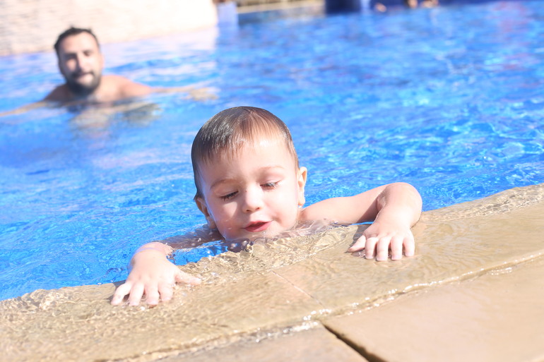 Территория отеля тоже не плохая! Очень красивая, хоть и не большая) Мы даже павлинов там встречали) Мирону понравилось! Особая радость- это бассейн с соленой водой. На море были волны, Мирон там не особенно купался, а вот из бассейна его по нескольку часов вытащить не удавалось!