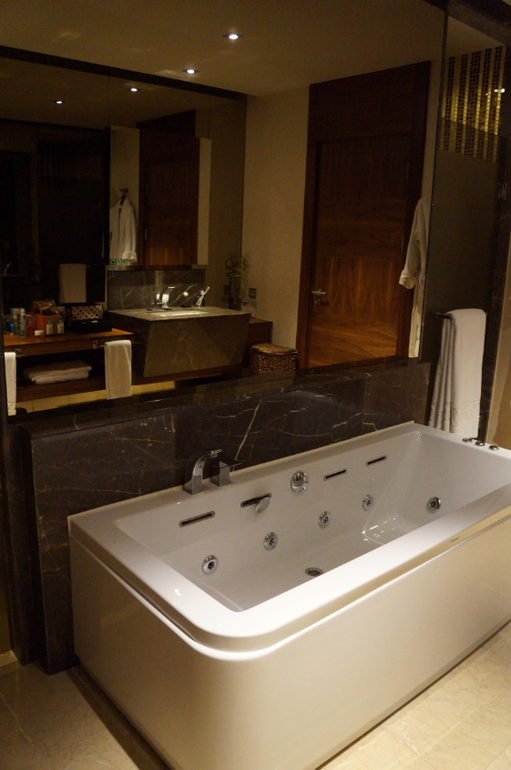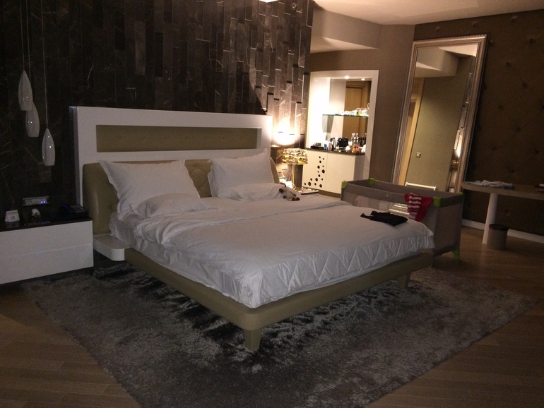 Номер - это мечта. 80 кв.м, с огромной кроватью, гардеробной с кодовым замком, ванной-джакузи, кофе-машиной, отличным мини-баром, халат/тапочки для нас и нашей дочки, косметика Булгари, весы, меню подушек и многое другое.