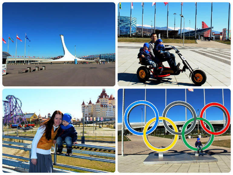 На фото выше, за нашими спинами Сочи парк и отель Богатырь (находится совсем рядом с Олимпийским парком), туда мы не пошли, т.к. там мало аттракционов на наш возраст. Стоимость посещения парка 1100 руб взрослый, детский не помню, мои были бы бесплатно, НО на сайтах с купонами можно купить за 50 руб скидку 50% на посещение парка, в стоимость билета входит неограниченное пользование всеми развлечениями)