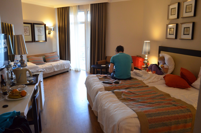 Наш отель AKKA ALINDA HOTEL 5*,корпус комфорт, номер на 3-м этаже 2307. Очень нам понравился номер - просторный, с балконом, все отлично. Так получилось, что мы приехали в перерыве между бесконечными подачами еды и были очень голодными. Через некоторое время в номере появились фрукты, сок и вино, это было просто чудесно!!! Мы перекусили и отправились исследовать территорию. Нашли детскую площадку и детский клуб. Погуляли там. Затем отправились на ужин и конечно после ужина всей семьей отрубились в 9 часов вечера и проспали до самого утра.