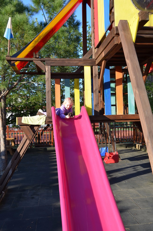 Побыв там где-то часик, решили совершить путешествие в крытый бассейн. Поднялись в номер, захватили круг для Аленки и купальную одежду всем, потопали в бассейн. Дочкиной радости не было предела. Накупались всей семьей от души! Потом, конечно, на обед и в номер спать.