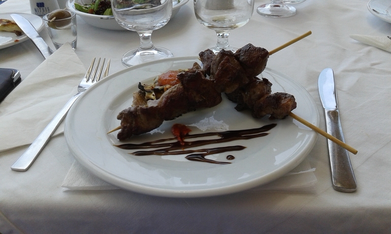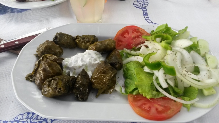 В стоимость экскурсии входил обед и стаканчик белого вина (для взрослых) - очень приятный и сытный: салат, дзадзыки (греческий соус из йогурта, свежих огурцов и специй), сувлаки (шашлыка) и мякгого багета. Еды было вдоволь, каждый проголодавшийся после морского путешествия мог получить добавки!