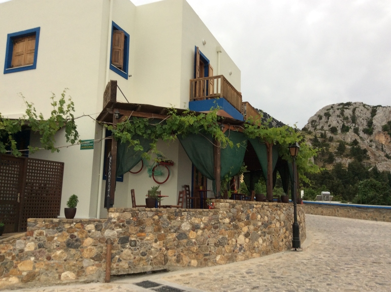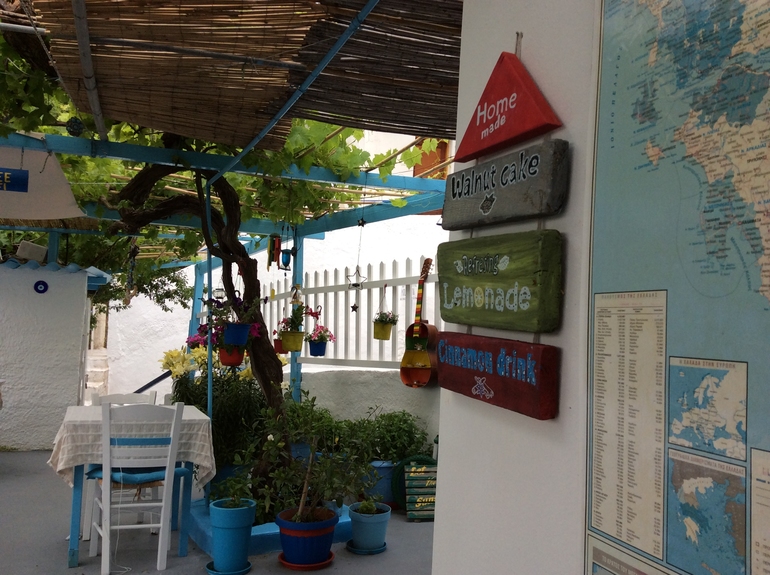 ну, и пообедали в таверне у Костаса "Но стресс"! Меню традиционное греческое, вскусно и по-домашнему, как будто в деревне у бабушки (средний чек с алкоголем 50 евро, 3 персоны). Попробовали домашний лимонад, мусаку, долму и дзадзыки, греческий салат и куриную грудку на гриле с картофелем (попросили ребенку), домашний лимонад и раки. Вид с террасы ресторанчика замечательный: виноградники, оливковые рощи, домишки, церквушки, горы, море! Есть бесплатный Wi-Fi, Костас предоставляет пароль, интернет резвый, все отлично.